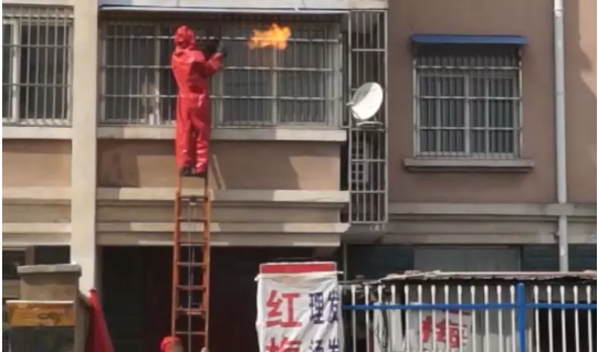 在房间的雨棚下,消防员发现一处排球大小的马蜂窝。消防员立即穿上防蜂服,利用杀虫剂进行火攻。