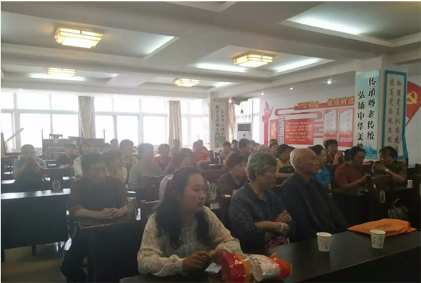 活动现场社区居民认真观看教学视频