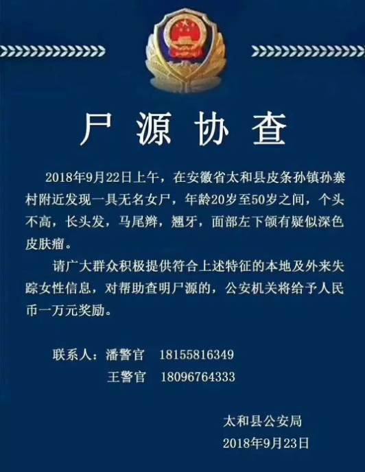 昨天,太和县公安局发布尸源协查通报:在皮条孙镇孙寨村附近发现一具无名女尸,现悬赏征集线索。详细信息如下:尸源协查2018年9月22日上午,在安徽省太和县皮条孙镇孙寨村发现一具无名女尸,年龄20-50岁